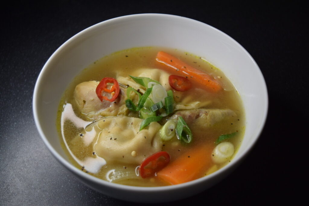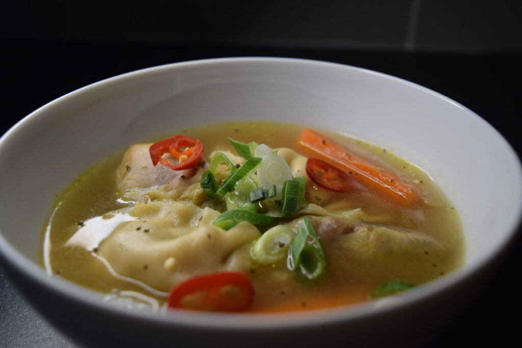 - To make a broth, add chicken stock, sliced ginger, onions, soy sauce and honey in a saucepan and bring it to a boil.